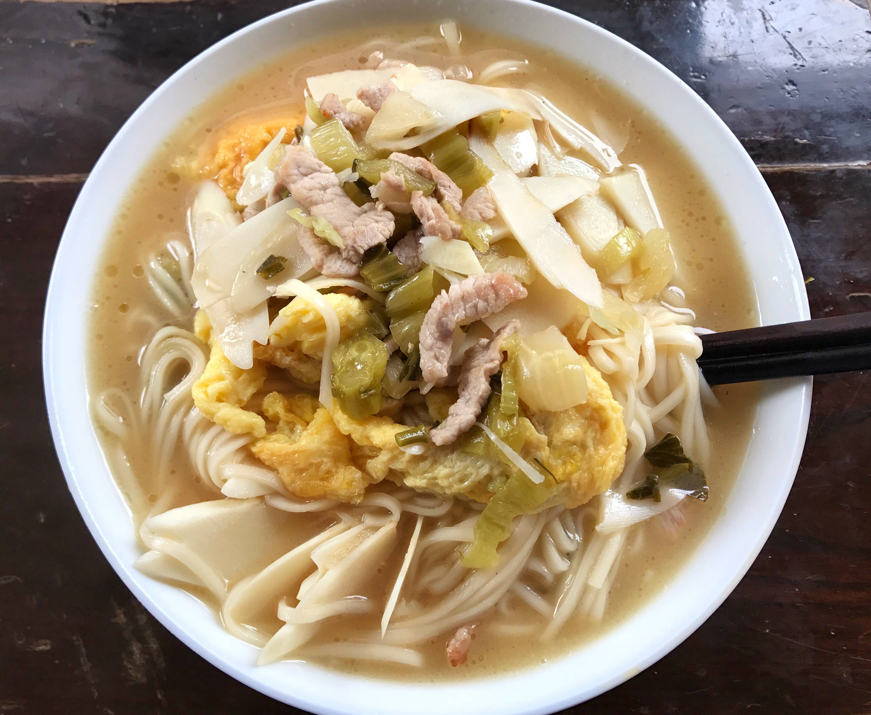 面中的鸡蛋是自己家的土鸡生的蛋,其中的鞭笋是奶奶从山上新鲜采挖来的,味道超级鲜美,百吃不厌。