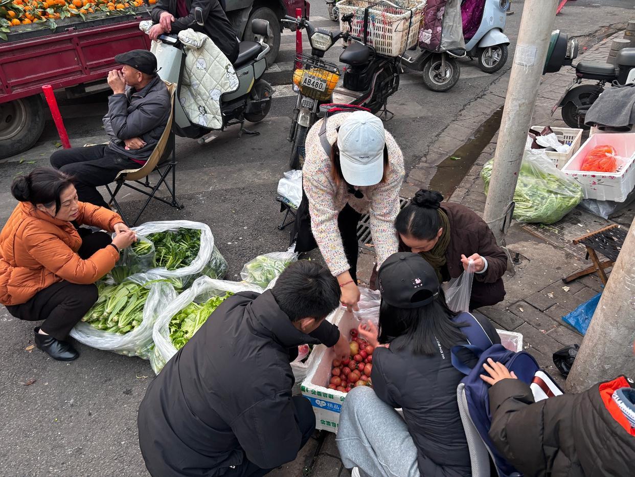 12月9日下午,武汉市江岸区后湖五路的路边聚集了不少菜贩,00后女生陈文靖的摊位也在其中。她热情地招呼着每位客人,熟练地帮忙挑选、装袋、递菜找零,忙个不停。