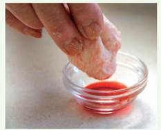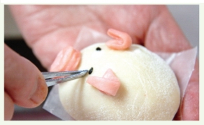Step 4:用红色面团碾成薄片,用圆形印出猪鼻形,再切三角形做猪耳,抹上少许水沾上猪耳和猪鼻,用筷子笃出两个猪鼻孔。