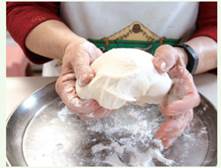 Step 2:面粉、泡打粉、盐一同筛入盆内,加鸡蛋、糖、生油及鲜奶,再放入酵母料搓匀。搓成软粉团后,用保鲜纸盖严,放置于温暖处,待发至双倍大。