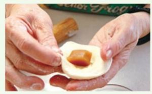 Step 3:取出软粉团,搓匀分切11份。取其中1份加入红色素搓匀留用。将其余面粉搓圆,包入莲蓉再搓成包形。