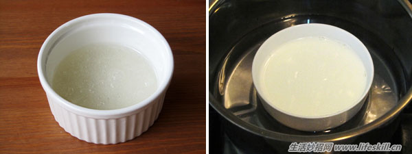 2.鲜乳以小火隔水加热3分钟熄火,静置于锅中一会,利用余热回温,也省燃气。(加热的水温不超过60℃)